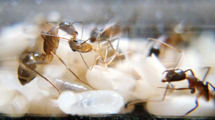 Makanan diberikan kepada larva dengan trophallaxis, sebuah proses di mana semut regurgitates makanan cair yang diadakan di tanaman tersebut. Seorang pekerja baru menghabiskan beberapa hari pertama dalam merawat kehidupan dewasa untuk ratu dan muda. Kemudian setelah dewasa semut bertugas untuk menggali dan bekerja sarang lain, dan kemudian untuk mempertahankan sarang dan mencari makan.